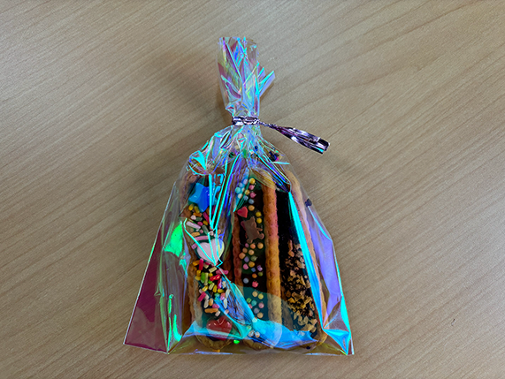 背中にそっとチョコレートを隠し持っていました。